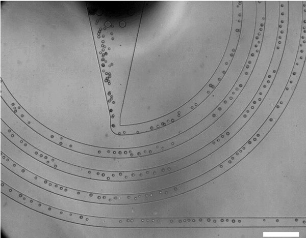 Microscopic image of beads moving through spiral channel. (scale bar indicates 500μm)