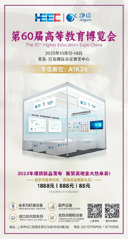 第60屆中國高等教育博覽會在青島紅島國際會議展覽中心圓滿落幕!上海凈信攜樣品前處理設備/小美超聲波系列產品/拓赫機電科技實驗室通用設備,在A1館(展位號A1K26)登臺亮相,為各高校提供樣品前處理解決方案。